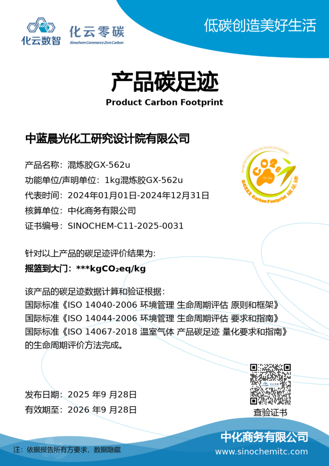 近日,由中化商务有限公司(以下简称“中化商务”)提供碳足迹管理服务的中蓝晨光院GX-562u混炼胶产品,顺利通过国际权威认证机构SGS的严格评估,获得产品碳足迹证书。此次认证的通过,标志着中化商务在绿色低碳咨询领域再添重要成果,为产业单位绿色转型与国际市场拓展提供坚实支撑。