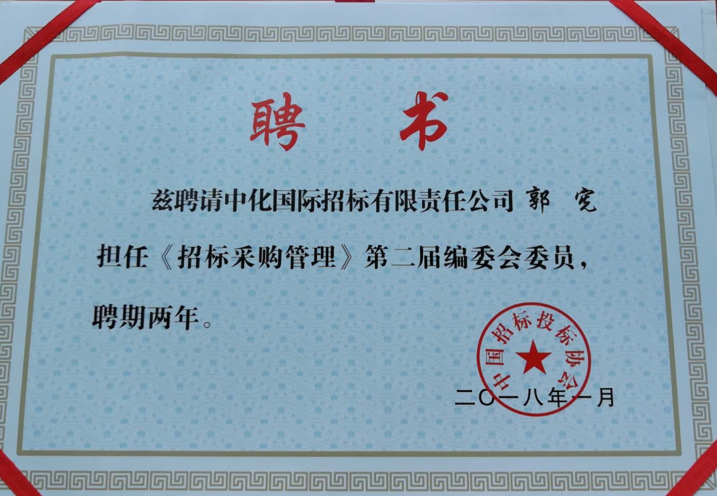 近期,中国招标投标协会向中化招标质量总监郭宪正式颁发聘书,聘任郭宪担任《招标采购管理》杂志第二届编委会委员。