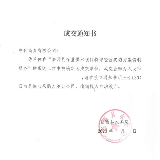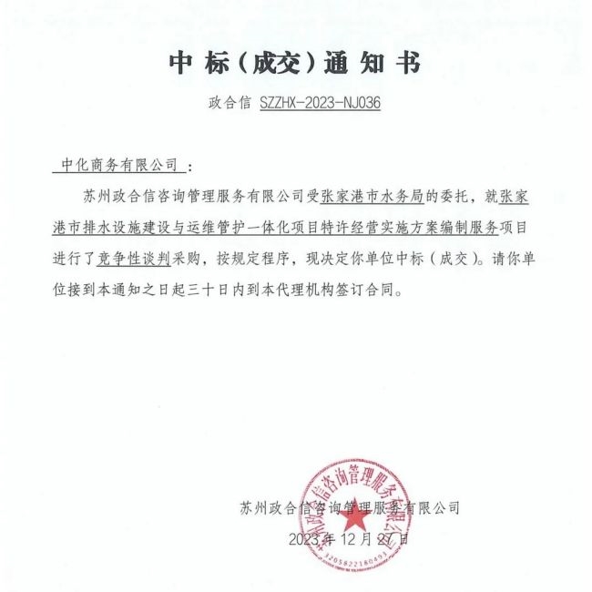 近日,中化商务收到江苏省张家港市排水设施建设与运维管护一体化项目(以下简称“张家港市管网项目”)特许经营咨询服务和河北省临西县存量供水项目(以下简称“临西县供水项目”)特许经营咨询服务成交通知书,此次中标的两个项目是政府和社会资本合作新机制发布以来公司首批落地的特许经营模式咨询项目。