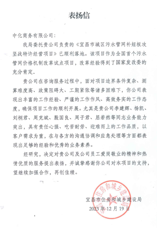 中化商务产业咨询团队紧随政策发展要求,自2022年以来倾注核心力量,加大对水务水利领域的研究与投入,并助力全国首个污水管网攻坚及配套价格机制改革类型的特许经营项目——湖北宜昌市城区污水管网补短板攻坚战特许经营项目成功落地,专业能力和敬业精神得到客户的认可。